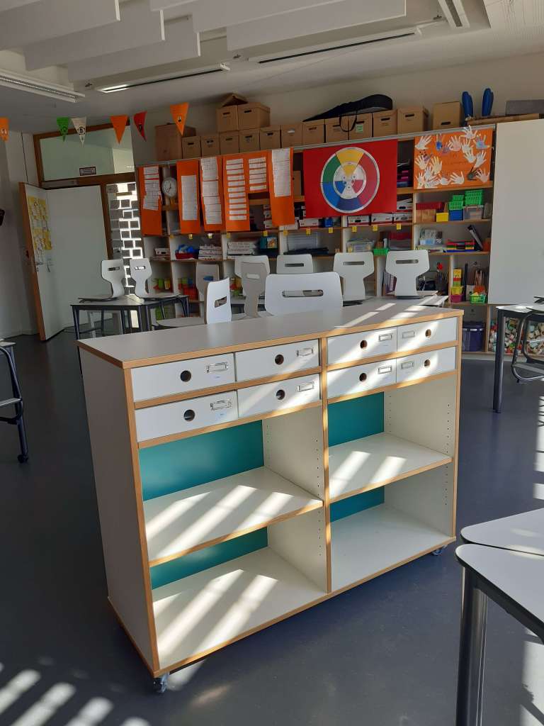 Aber wohin mit den ganzen Materialien, die die Kinder ja noch in der Schule haben? Alles wird sauber in das große Wandregal gestapelt . Dann kommt die Reinigung der Tische, Regale, Stühle und Böden dran. Wenn das fertig ist, muss alles aus dem Wandregal wieder raus, dann wird das auch noch geputzt.