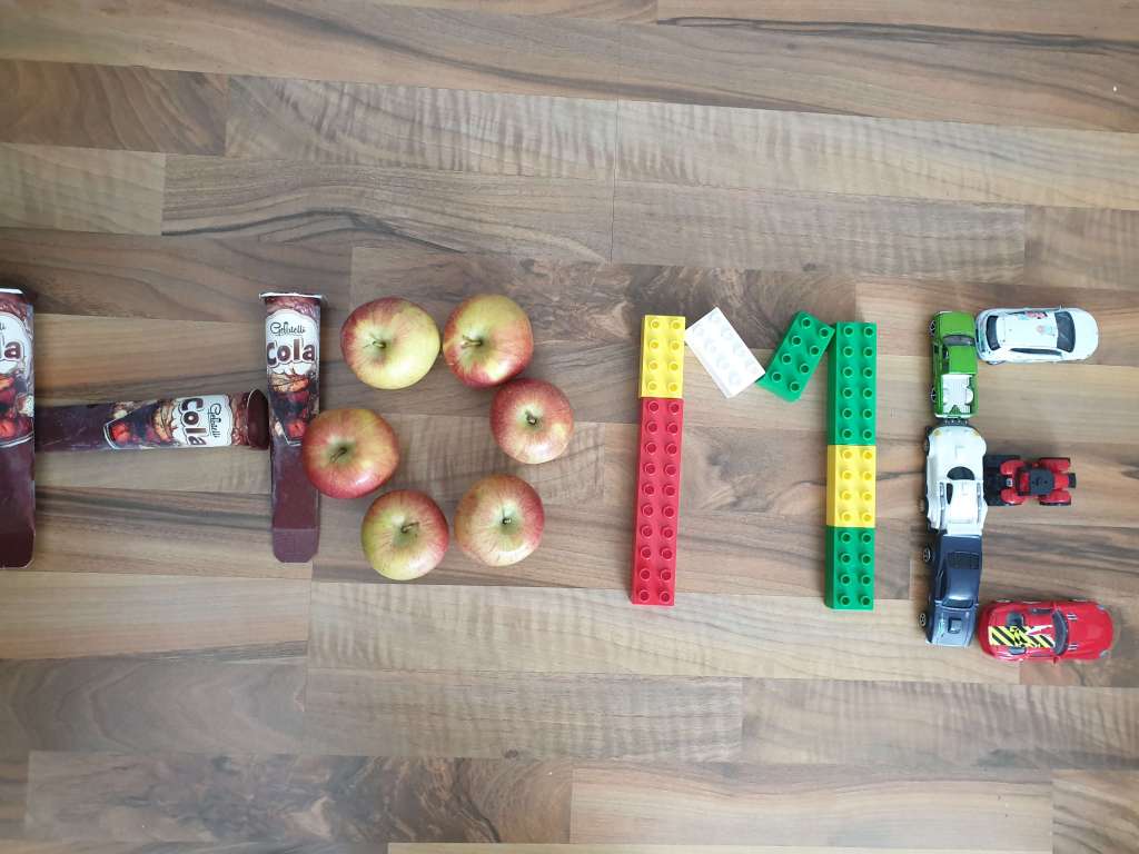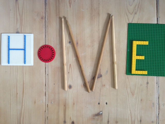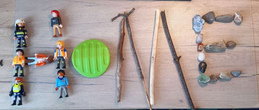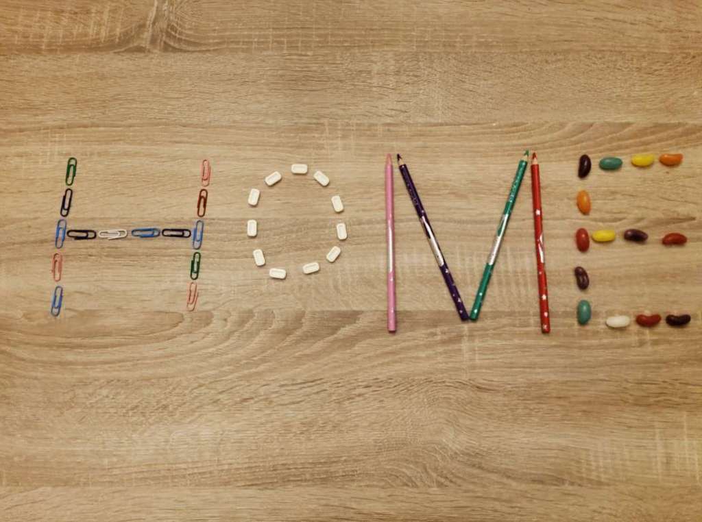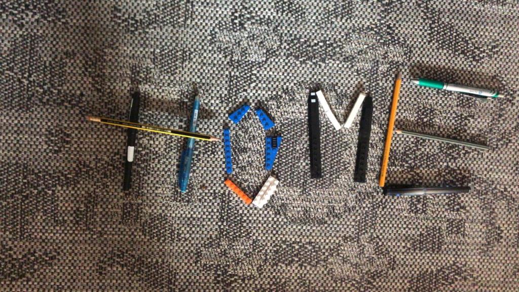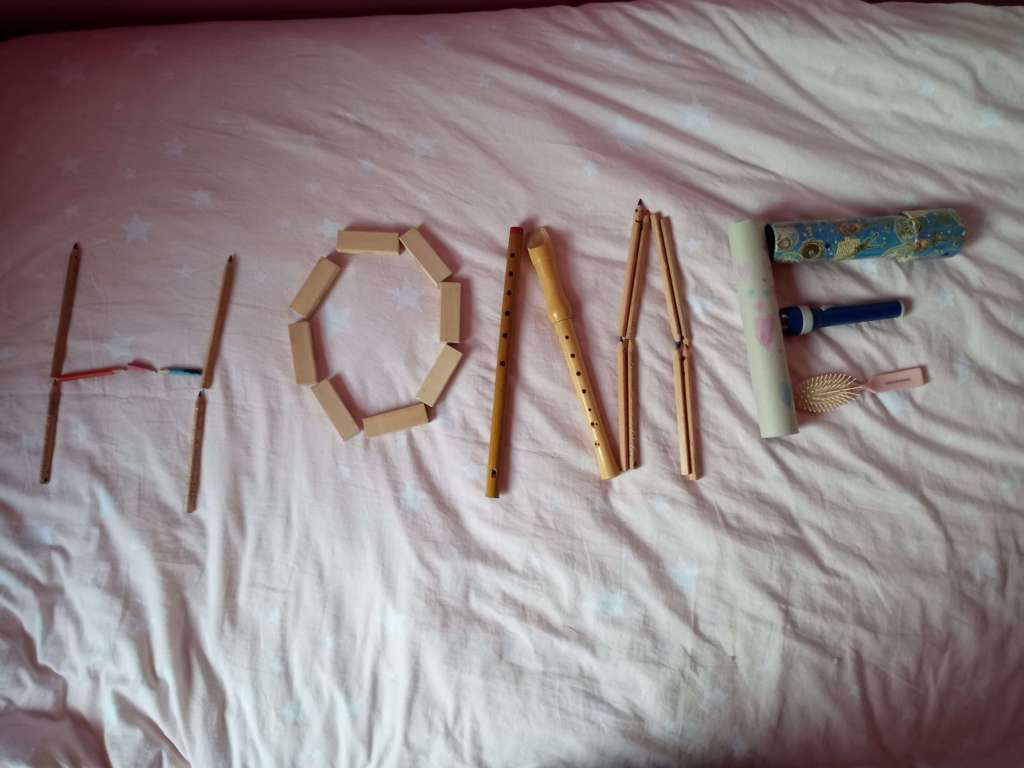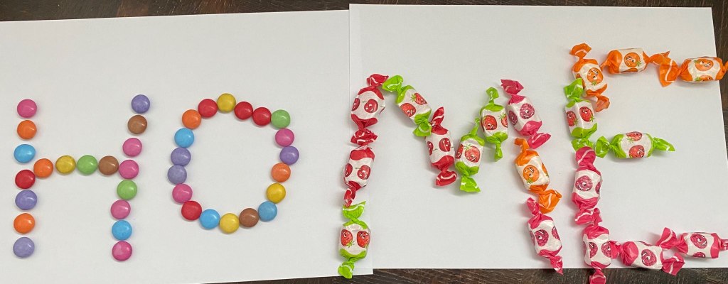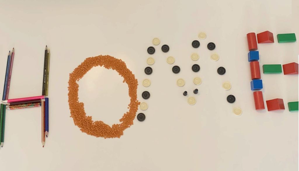 Die Kinder der Klasse 2a haben zuhause mit verschiedenen Materialien das Wort HOME gelegt.