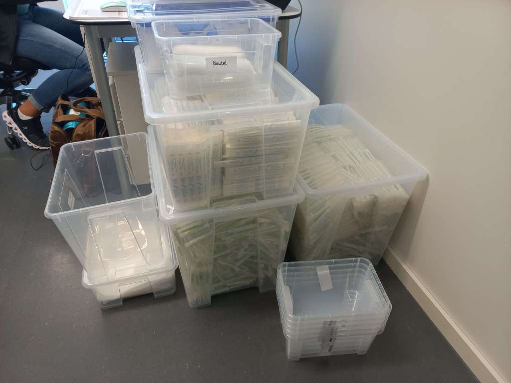 eine fünfte Kiste für Plastikbeutel in 3 Größen: für die Rückstellproben, für die Klasse und für die Schule