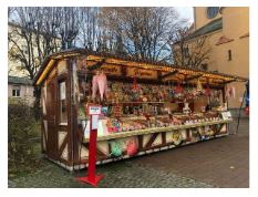 Auch dieses Jahr erfreut sich das Angebot an der Augsburger Straße großer Beliebtheit. Gebrannte Mandeln, Lebkuchenherzen, Popcorn und viele andere Spezialitäten werden in dem stimmungsvoll beleuchteten Stand angeboten.