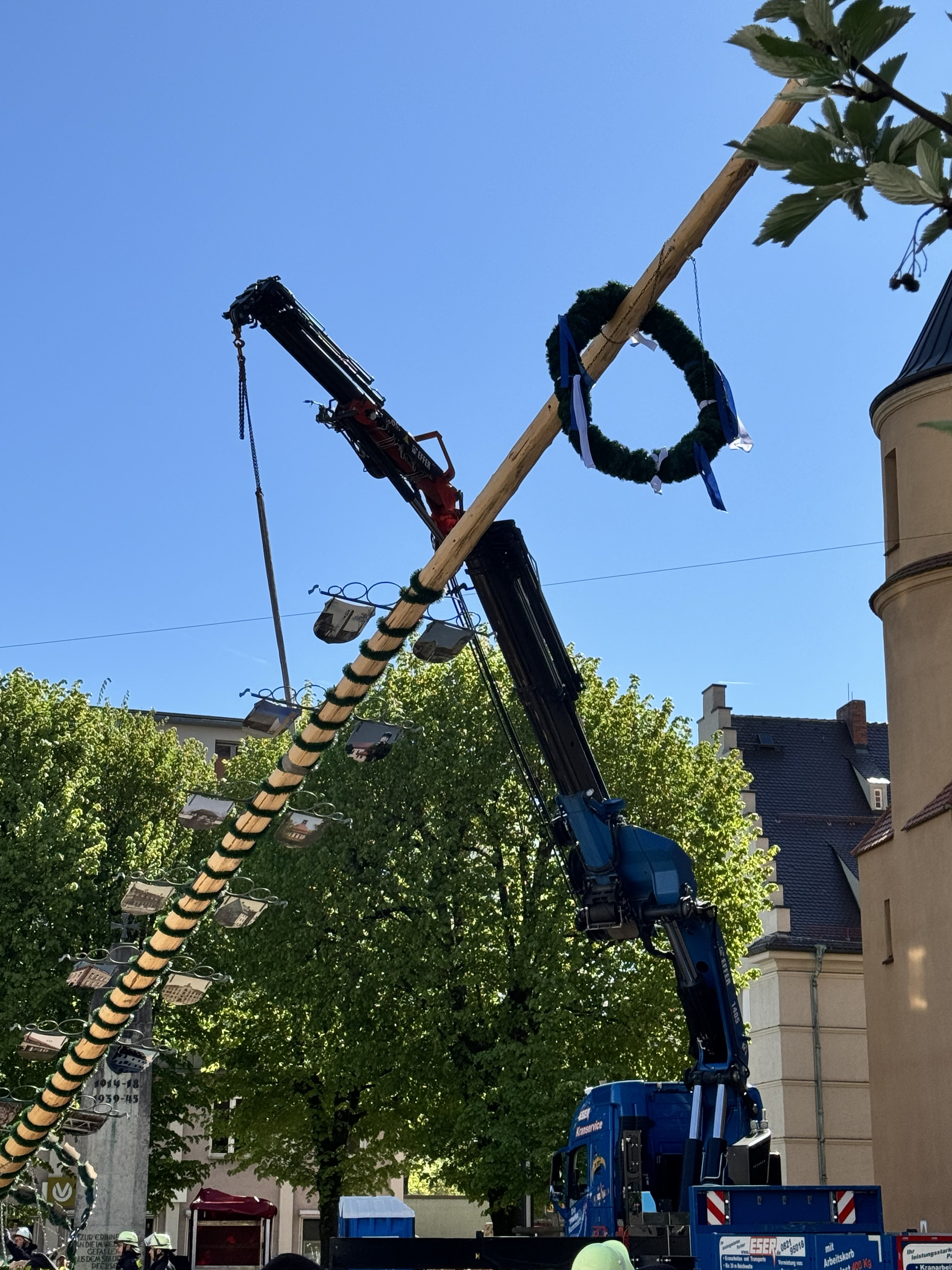 Mit Blasmusik, Pferdegespann und vielen Teilnehmern wurde am Samstag vor dem 1. Mai wieder der Pferseer Maibaum auf seinen Platz vor der Herz Jesu Kirche geleitet.