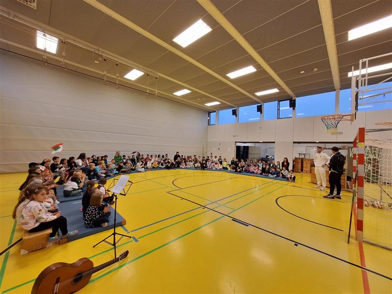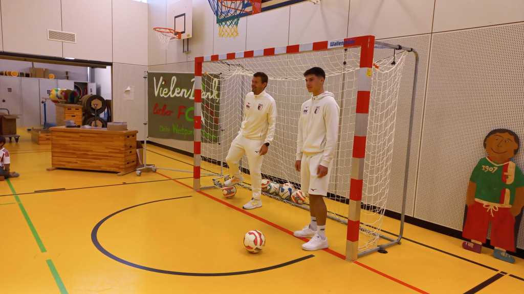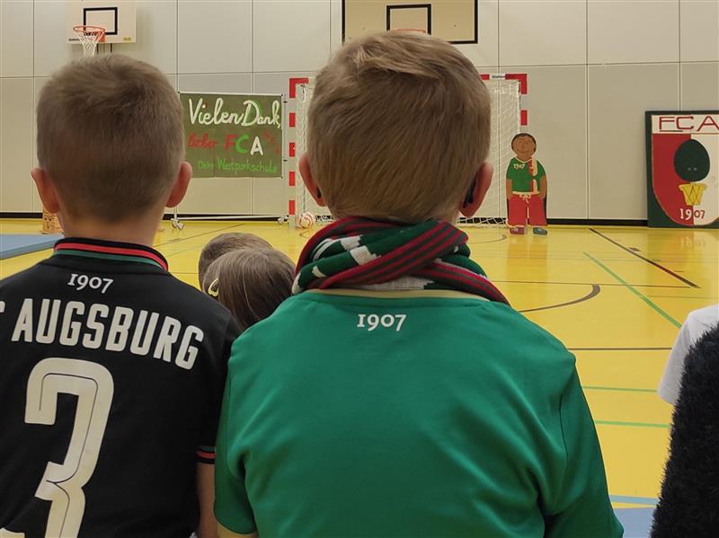 Voller Erwartung saßen in der Turnhalle schon die Erstklässler bereit, denn ihnen galt der Besuch der Fußballer. Traditionell verschenkt der FCA jedes Jahr an alle Schulanfänger Sportbeutel und Autogrammkarten.