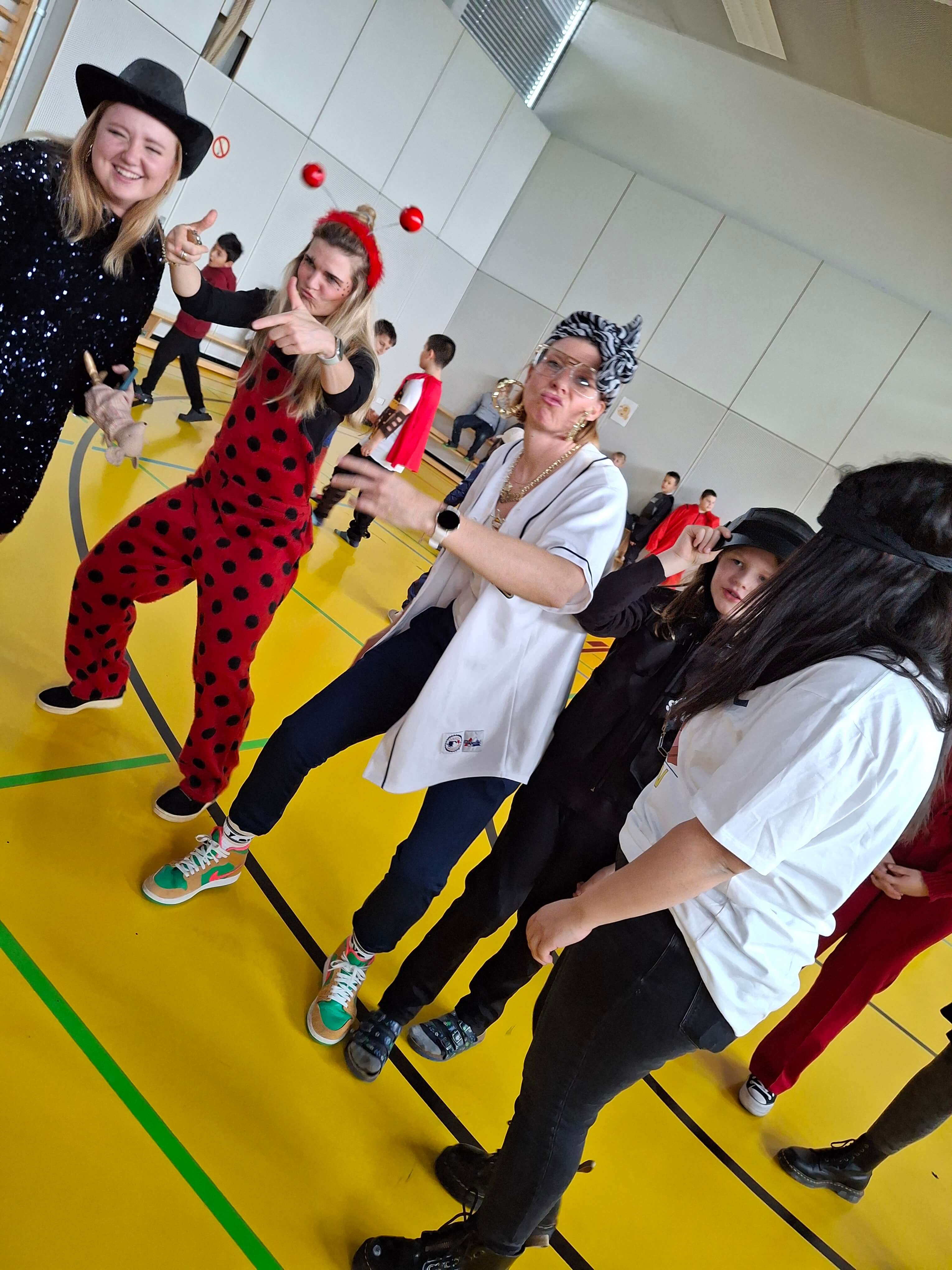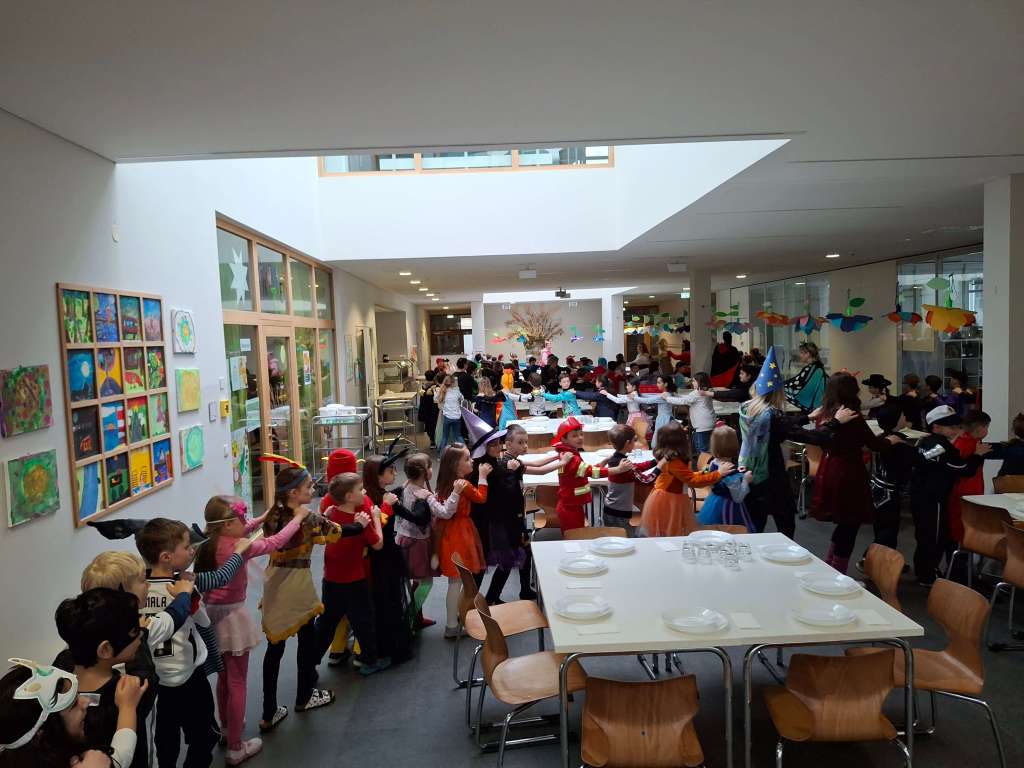 Heiß erwartet ertönt nach der Pause durch die ganze Schule die Musik zur Polonaise und schon kommen die 2. Klassen aus dem Pavillion oben im Schulhaus an, die uns alle einsammeln zum langen Gaudiwurm durch das Schulhaus.