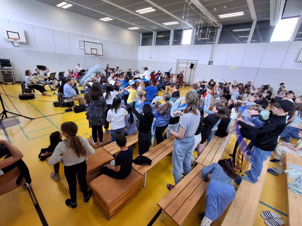… läuft das Wasser über die Wanne und flutet das ganze Haus. Die Streichinstrumente lassen die Wasser fließen, die Kinder tauchen die Turnhalle passend dazu in ein blaues Tüchermeer.