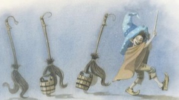 O je, da kann nur noch der große Zaubermeister helfen, der rechtzeitig nach Hause kommt und den Besen wieder stoppt.