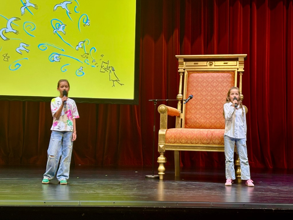 Wir haben auf der großen Bühne im Staatstheater im Martinipark unseren Rap „Wir wollen Frieden“ zur Melodie von We will rock you vorgetragen. Es war ein tolles Erlebnis, auch wenn wir sehr aufgeregt waren.
