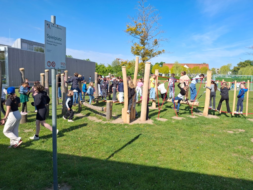 Kaum waren die Absperrbänder weg, eroberten sich die Kinder den neuen Spielbereich und bewegen sich so in der Pause vielfältig.