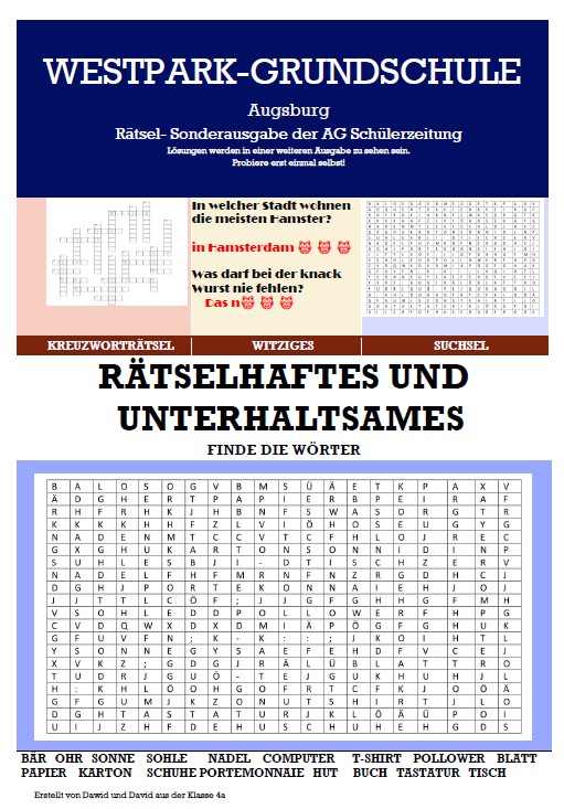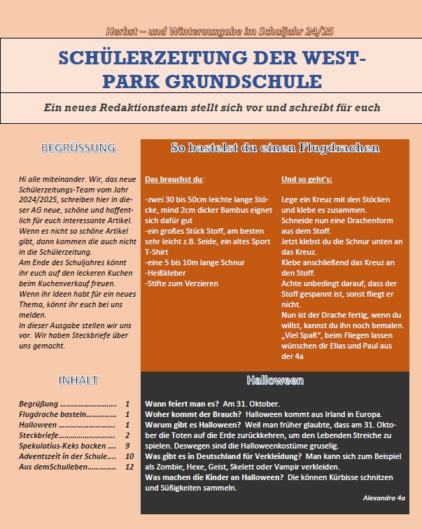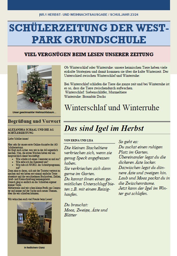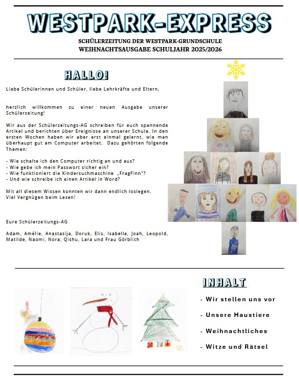 Schülerzeitung „Westpark-Express“ Hier veröffentlichen wir in loser Reihenfolgedie Ausgaben unserer Schülerzeitung „Westpark-Express“. Viel Spaß beim Lesen! Ausgabe Dezember 2025 Ausgabe Dezember 2024 Ausgabe Dezember 2023 Ausgabe April 2023 Ausgabe Februar 2023 Ausgabe Mai 2021 Ausgabe April 2021 Ausgabe Februar 2021 Ausgabe Januar 2021 Ausgabe Dezember 2020